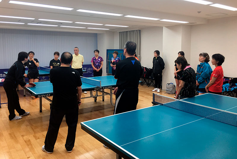 ツブ高ラバーの基本の打球点のとらえ方はどのツブ高ラバーでも同じですが、ラバーの種類(スポンジあり、なし、縦目、横目、厚さ)によって多少異なります。微妙なタッチでの打球法も講習しました。