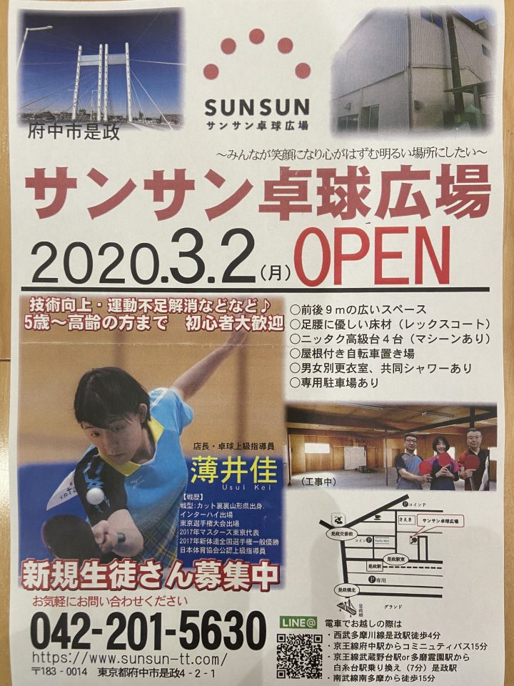 昨日3月2日(月)府中市是政にサンサン卓球広場がオープンしました。