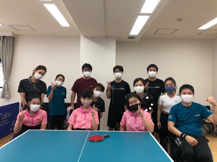 ですが、この状況下ではありますから、参加者は当初の予定メンバーの半数。台も予定より減らし、いつも通りの換気、消毒、三密を防ぎ行いながら、T.T Laboコーチ陣と、さらにはゲストコーチとして卓球関係者なら誰でも知っているSTIGAジャパンの「塩野真人」さんも加わってくださり、車椅子卓球女子3人への指導をさせていただきました。