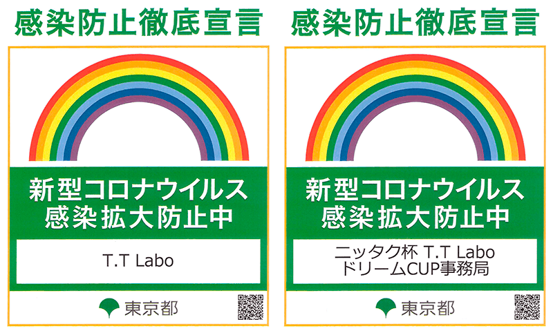 昨今、東京都の新型コロナウィルス感染者が増大となり、T.T Laboはこの感染拡大を防止するためにも、この度、東京都新型コロナウィルス感染防止徹底宣言を申請し、受理していただきました。また9月末から開催予定のニッタク杯ドリームCUPも感染防止徹底宣言をするイベント(大会)を申請し、受理されました。※画像右下のQRコードにてご確認いただけます。