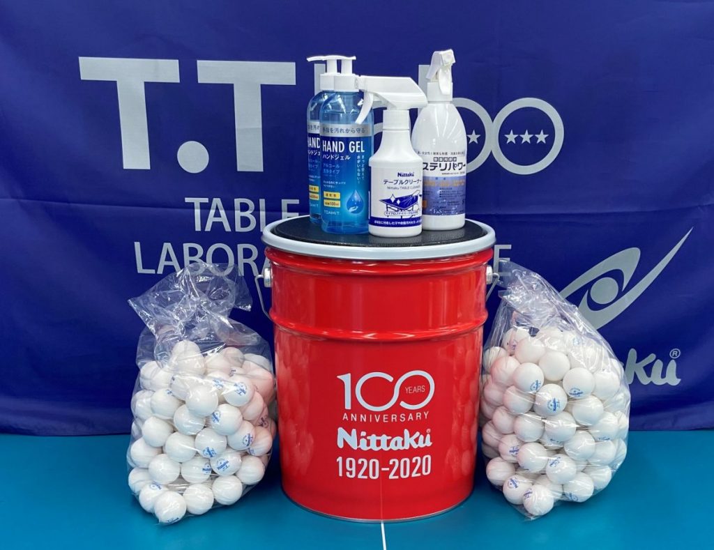 また、このウィルス感染防止には必要とされる備品として、ニッタク社からはT.T Labo使用球でもあるJトップトレ球の「抗菌Jトップクリーントレ球」(ニッタク社100周年記念缶付)、卓球台や備品などを除菌、消毒する除菌用ステリアパワースプレー、飛沫消毒に必要なテーブルクリーナー、スティガ社からは来場時に必ず消毒していただくハンドジェルなどのサンプルをご提供いただきました。感染防止徹底宣言事業店としては大変ありがたく存じます。早速毎日使用させていただいております。